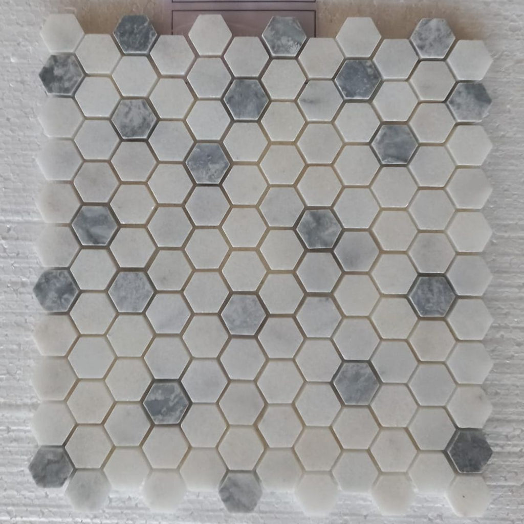 Enhance your space with the BIANCO & BLUE Hexagon Mini 12"x12" Honed Mosaic. This charming mosaic features a delicate hexagonal pattern blending crisp white and calming blue hues, creating a fresh and inviting look. The honed finish provides a smooth, matte surface that complements modern and classic designs alike while offering easy upkeep. Ideal for walls and floors, it delivers both style and lasting durability to elevate your home’s aesthetic.