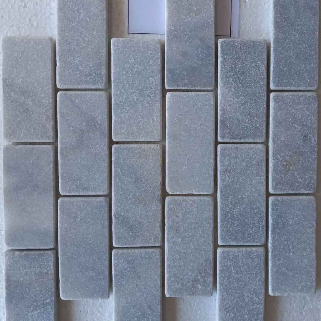 The BIANCO GREY Brick 2"X4" on mesh 12"x12" Tumbled Mosaic combining soft grey hues with a textured surface.