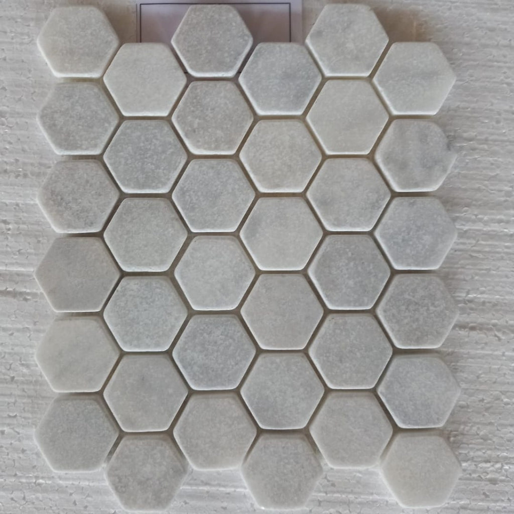 Refresh your interiors with the BIANCO WHITE Hexagon 12"x12" Honed Mosaic. Its clean, crisp white tones create a bright and airy atmosphere, while the hexagonal design adds a contemporary touch. The honed finish provides a smooth, matte surface that enhances the mosaic's elegance and makes cleaning effortless. Ideal for both floors and walls, this mosaic combines beauty and practicality to enhance any space with timeless style.