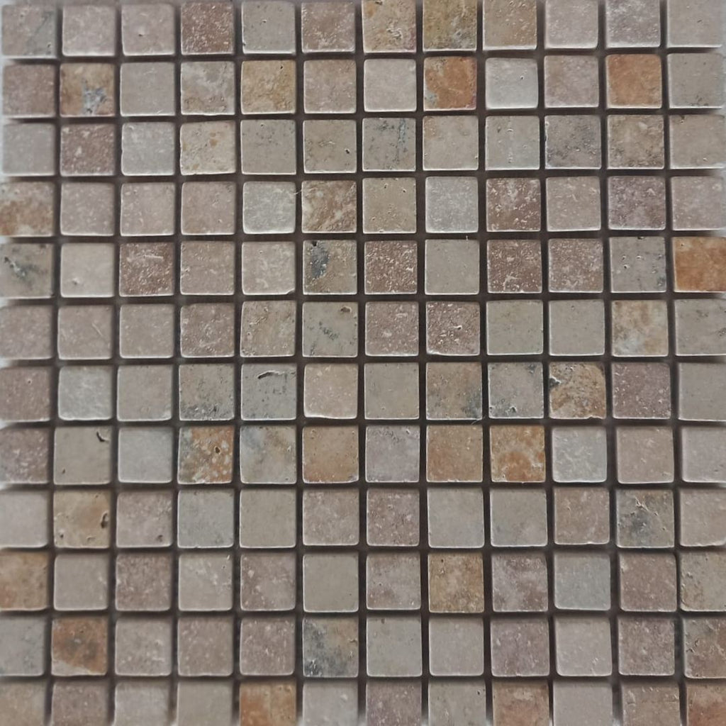 Elevate your space with the TRAVERTINE MIX COLOR Squares 1"X1" on mesh 12"x12" Honed Mosaic. This stunning mosaic features honed travertine tiles in a mix of natural colors, creating a timeless and elegant look. Perfect for backsplashes, showers, and accent walls, the mesh backing ensures easy installation and precise alignment. Its smooth finish offers a sophisticated touch while providing durability for daily use. Transform your design vision with this versatile mosaic that brings warmth and texture to any room.