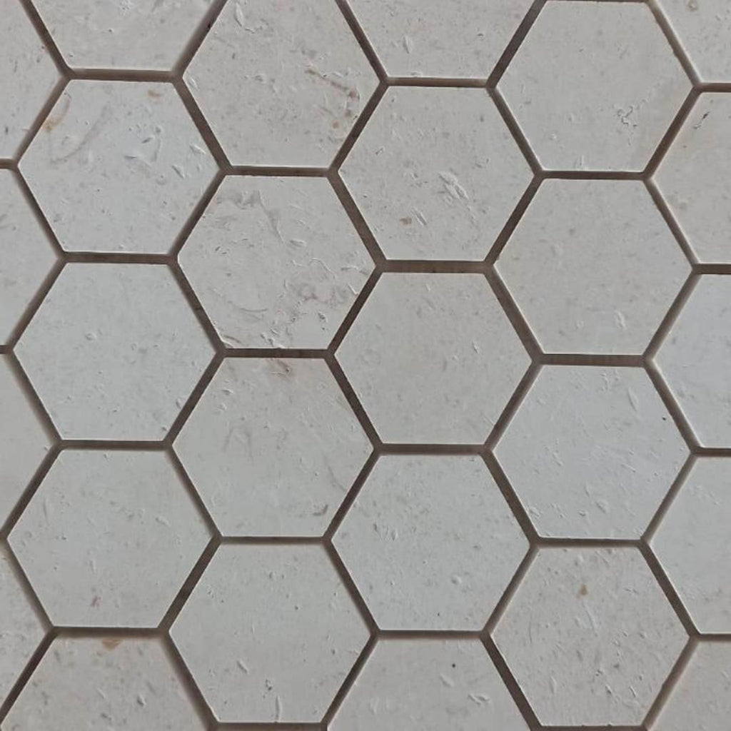 Elevate your space with the WHITE LIMESTONE Hexagon Honed Mosaic. This elegantly shaped mosaic offers a smooth, honed finish that enhances its natural limestone beauty while providing a subtle texture underfoot. Perfect for creating a timeless, sophisticated atmosphere, this durable tile is ideal for both walls and floors, combining distinctive style with easy maintenance. Transform any room with this versatile, high-quality choice that brings refined charm and lasting appeal.